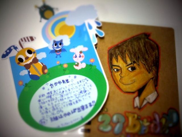 前期終了。職員室にて成績をつけてまとめていました。 3組の子から貰ったお菓子とカードに囲まれながら。 今日はbashi君がメモ帳の表紙に俺の似顔絵を描いてプレゼント... -