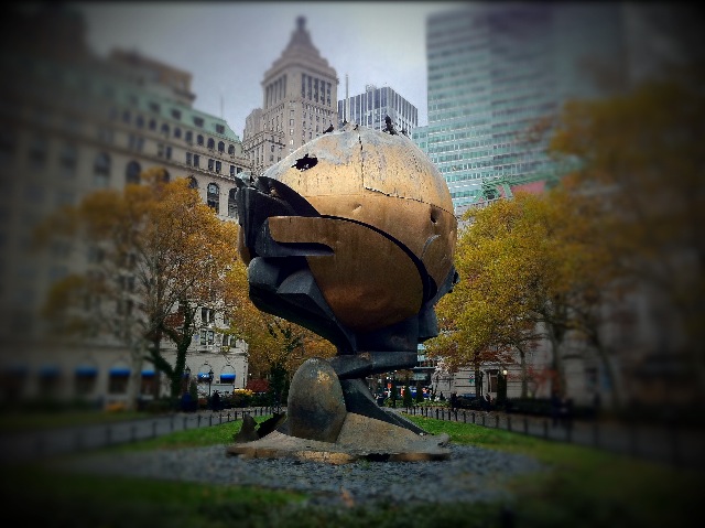 この像は119が起こるまでは貿易センタービルの間に飾られていた像。上部が溶けてグシャグシャになっているのが、痛々しさを感じます。二度とあってはならない事を象徴するように、溶けた像は平和の象徴ハト君たちの住処にもなっているようです。