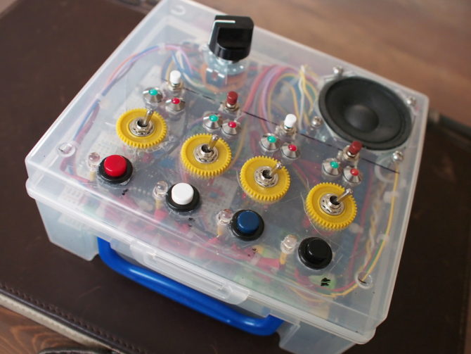 ↑昔【じーさんの発明品】の記事で孫のために4種類のサウンドが鳴る装置を作り出してしまった父に基盤を修復してもらい、みごとに復活。