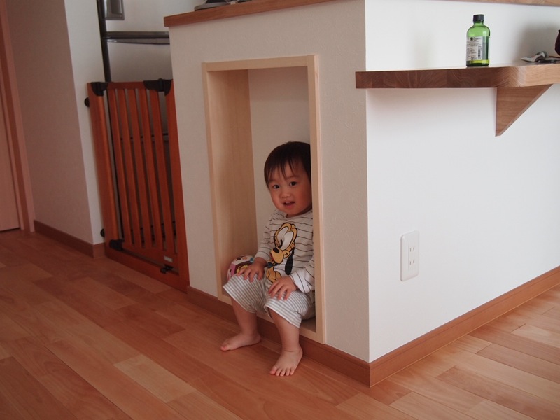 (左)雑誌とかを置く予定で作ったスペースが息子の休憩スペースになっています、、ダメとは言わないけどさ....(右)おじいちゃんから貰ったプラレールでマジで真剣に遊んでますww、俺の小さい時にソックリww。きっとおじいちゃんもそう思ってるだろうねww。