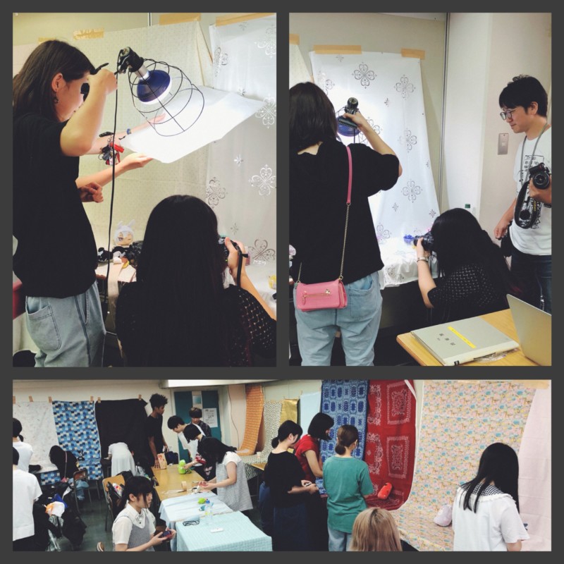 今日の写真撮影課題は物撮り、それぞれが背景を持ち寄ってライティングしながら撮影中。