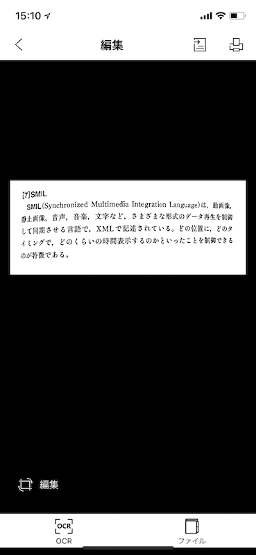 手順的には読み取りたいところの写真を撮って、そのあとトリミングモードになるので、変換したい部分だけを囲って、下のOCRボタンを押すとテキストに変換して保存してくれます。