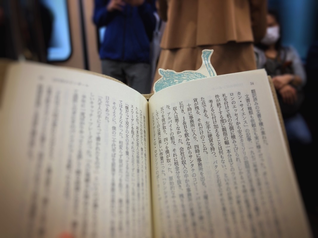 読んでいる本からヒョコッと顔を出すダチョウのしおりは昔友人からもらったグリーティングカード。 通勤の車内で隣に座った小学生がずっと見てて可愛い(笑)