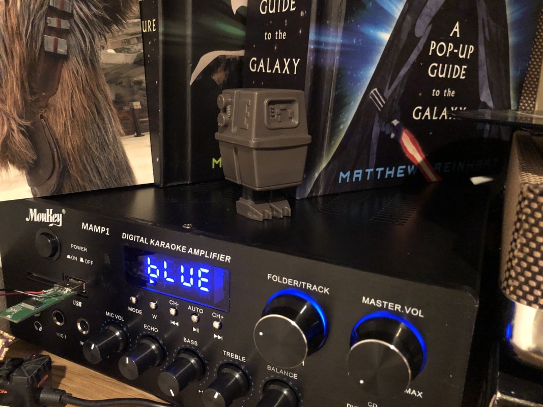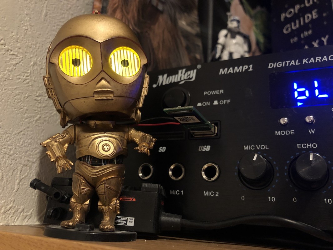 覚えていらっしゃるだろうか、ガチャガチャのC-3POを魔改造して作ったUSBメモリをアンプに接続してC-3POに記憶させたMP3データも、スピーカーから再生できるようになったのだ!!