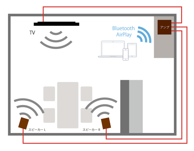 うちのリビングの見取り図はざっとこんな感じなのだが、主にTVから流れる音をアンプを通してスピーカーに送り、TVのスピーカーからも音が出るため、軽いホームシアターになっている。