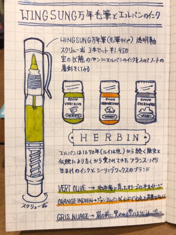 今回アイデア帳の着彩に使おうと思っていたのは↑こちらのHERBIN(エルバン)というフランスはパリ生まれのインクである。