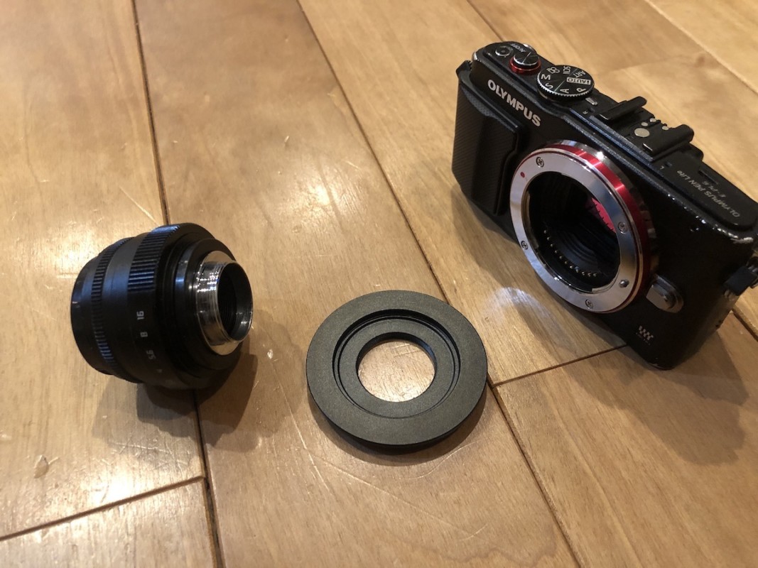 ↑今回自分が大切に使い続けているOLYMPUSのミラーレス一眼にアダプターをつけてCCTVレンズを試してみる。購入する時にレンズ単体もあるが、アダプター付きで購入という選択肢もあるので自分のカメラメーカーにあったアダプターを探せれば大丈夫だ。