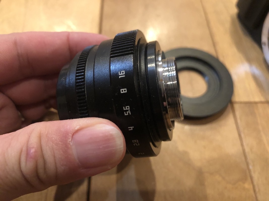 普通の一眼レフやミラーレス一眼はそのメーカーに応じたレンズを使うのだが、このCCTVレンズというのは取り付け部分がネジ式(径25mm)になっており、アダプターを使って自分の一眼レフに取り付けられるというもの。