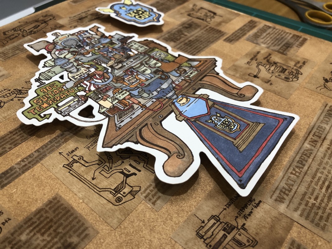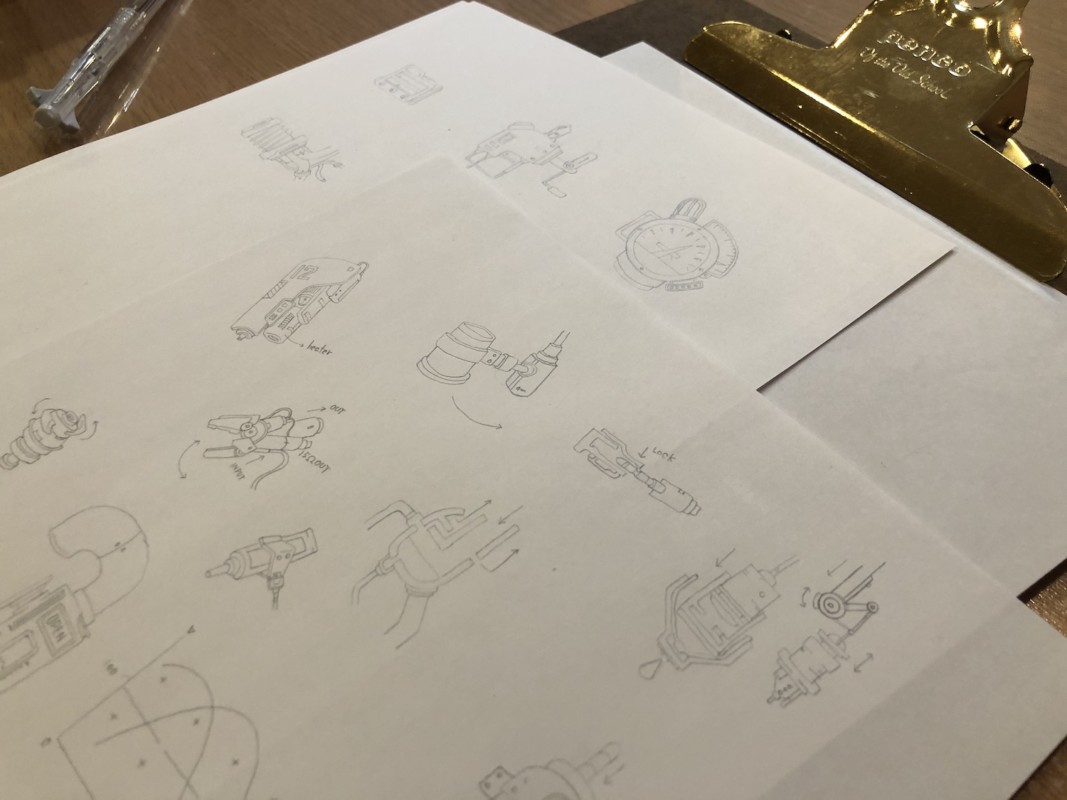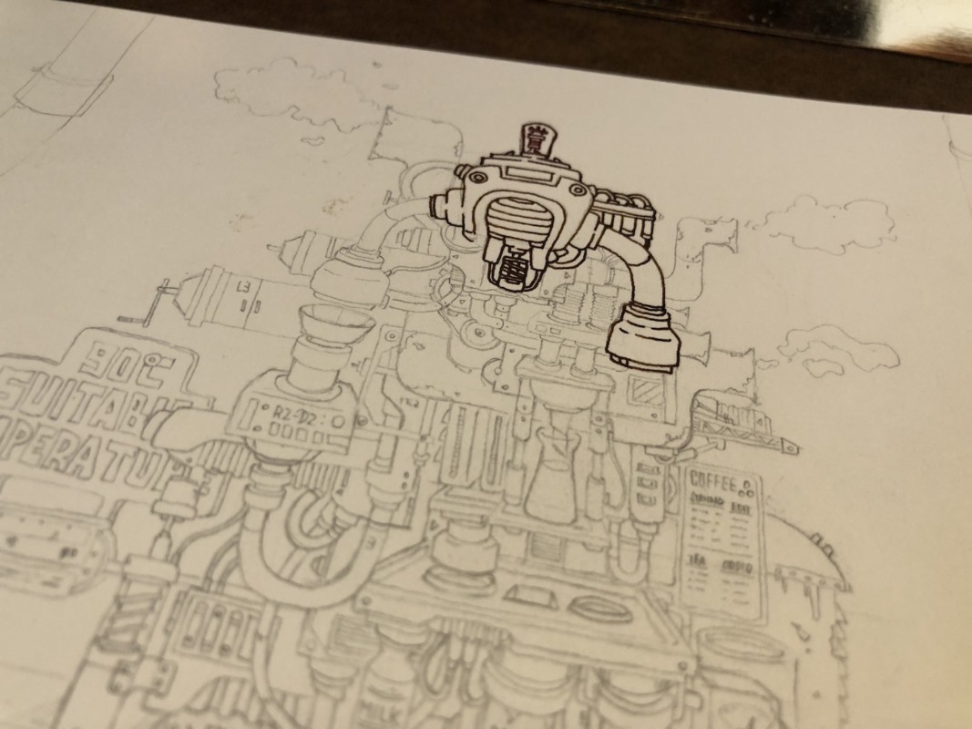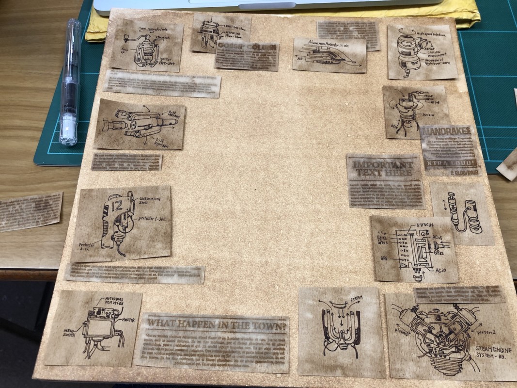 複雑な機械のパーツ・設計図の下書きをした用紙をコーヒーに漬けてみたり