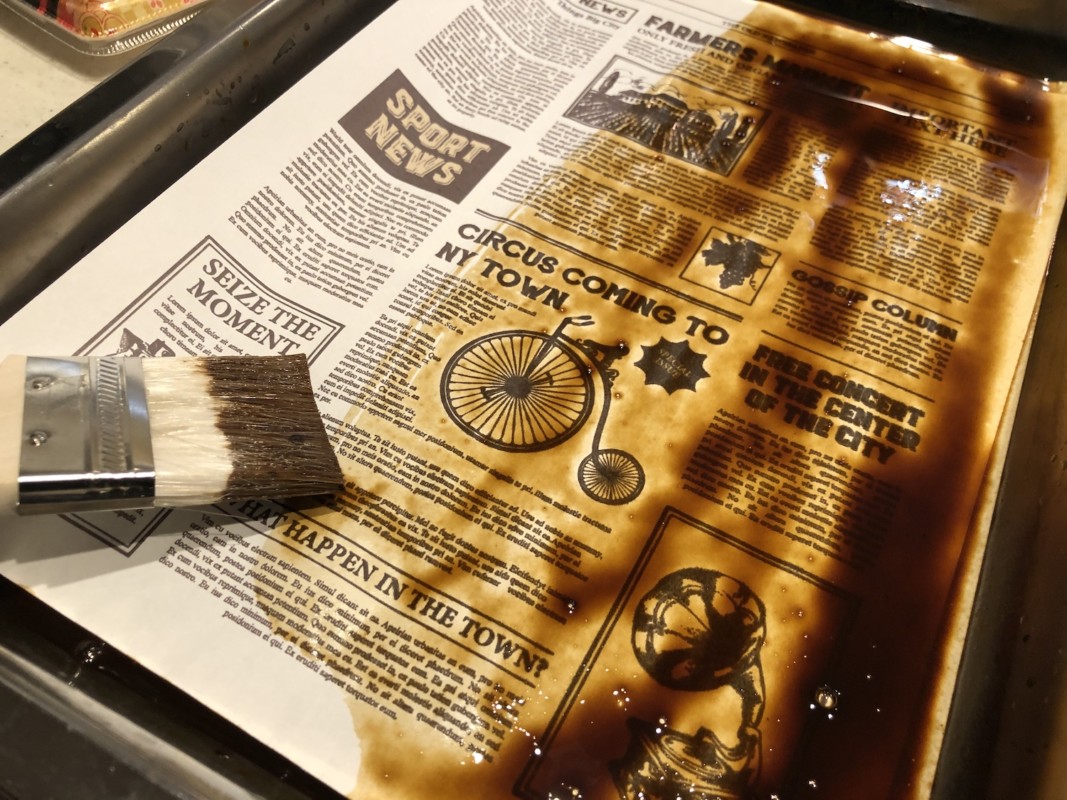 紙をどうやって古く見せようか考えた末、ヴィンテージな質感を出したくコーヒーに漬けることにしてみた。