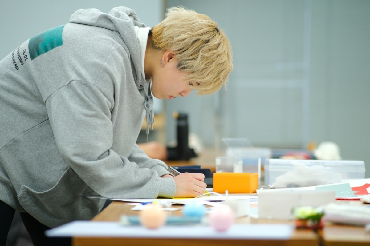 何気なく過ごしているいつもの教室、いつもの課題、いつもの手元、でもそんな日常の風景が、撮影の力によってある一種の魔法がかかり、それが更にグラフィックデザインの力によって見る人の心を揺さぶるモノに変化していく、そんな面白すぎる現場に今自分たちがいること、そしてそれを作る人間に自分がなるんだっていう楽しさを改めて感じてもらいたいと思った。