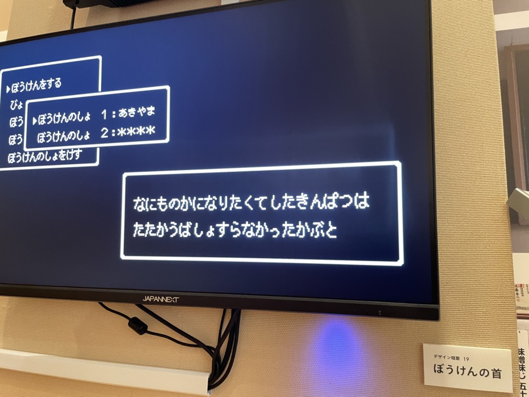 短歌をRPG風に再現した展示があったり、いやもう一番右の短歌最高だと思う。