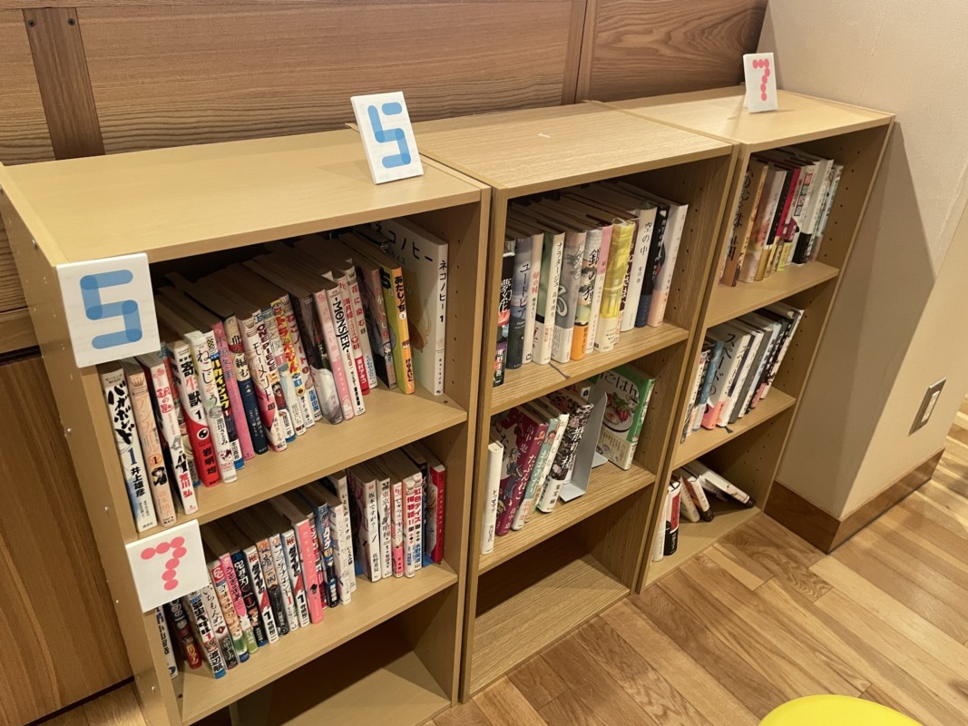 本棚の575がなかなか遊べるのだ、5の本棚には5文字の本のタイトル、7の本棚には7文字のほんのタイトルが置いてあるのだ、その中から自分で575になるように本を抜き取り並べ、SNSで写真を載せてみるというなかなか面白い企画である。