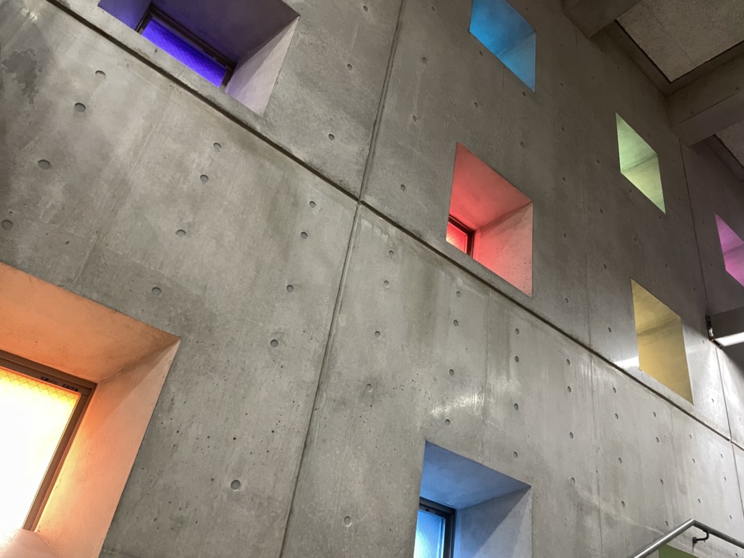 会場前の階段は、色違いの光が入り込む可愛らしい空間が出迎えてくれる。