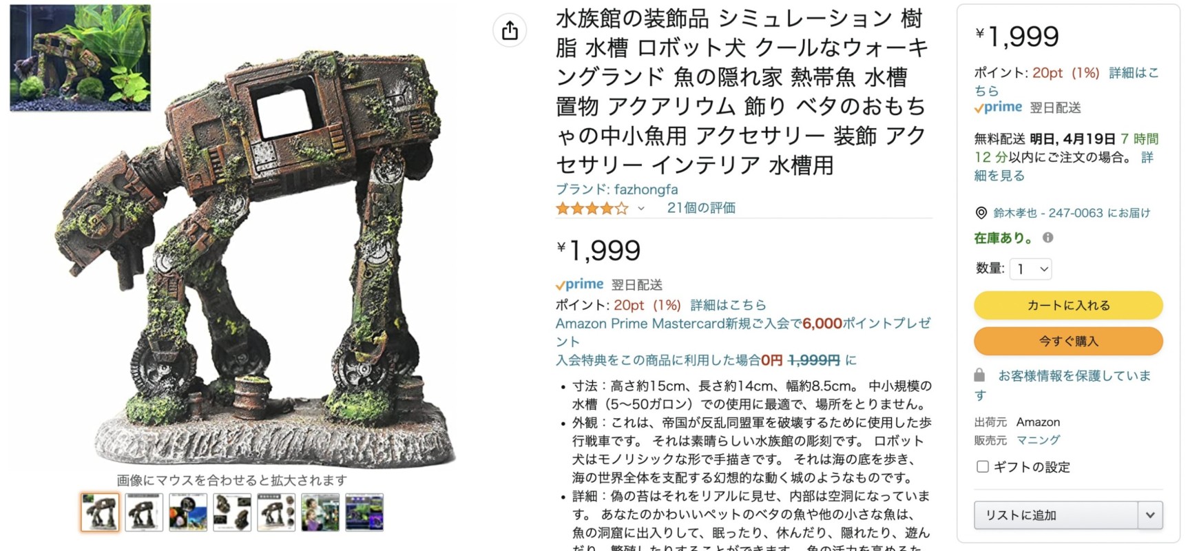 数年前から気になっていた海外のみで販売されていた、AT-AT風なアクアリウムがついに日本のAmazonでも買えるようになっていたことに気がついた。