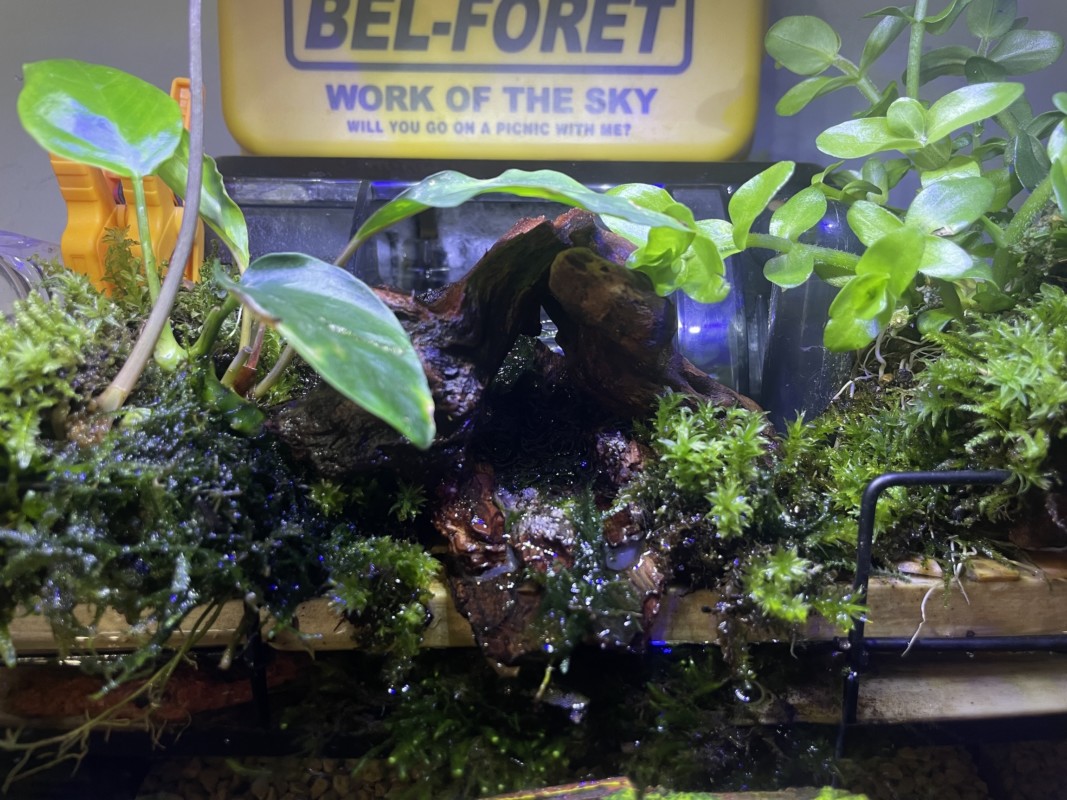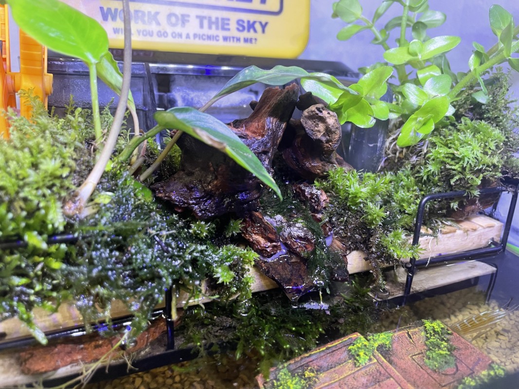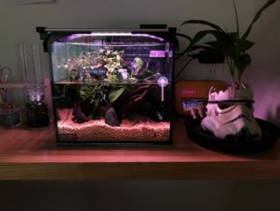 ずっとやってみたかったスター・ウォーズ風アクアテラリウムがついに完成した!! Sサイズ水槽でここまで凝縮された世界は見ていて楽しいものである、ちなみに左側に引っ掛けてあるサブ水槽は、娘が山で持って帰ってきたヌマエビたちの楽園である。