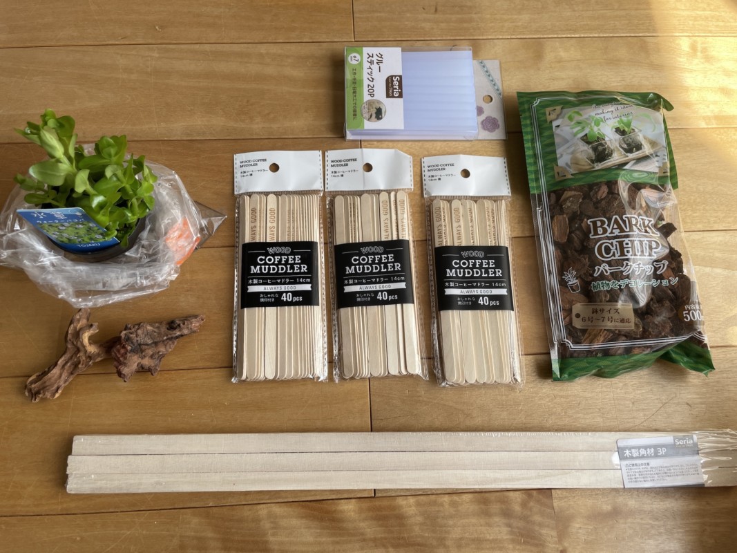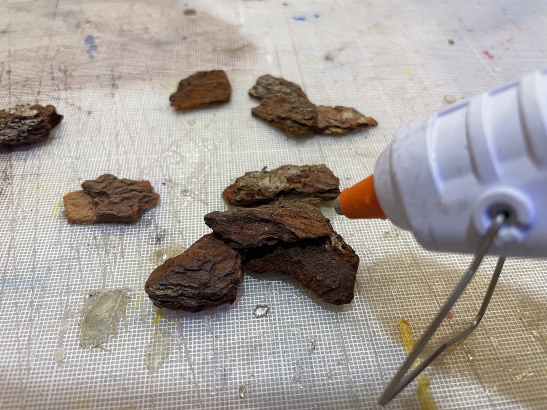 これもまた100均のガーデニング用品売場にあったウッドチップをグルーガンで組み合わせて水が流れるように道を作っていく。