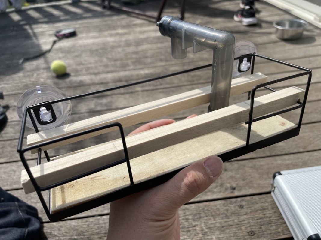 細い角材にルーターで溝を作って、ラックの柵部分に引っ掛ける。
