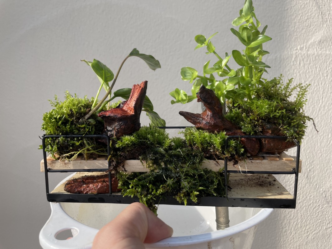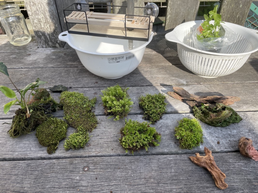 そして近所の山から採取してきた苔たちと、以前からある水草をラックにうまくレイアウトしていく。