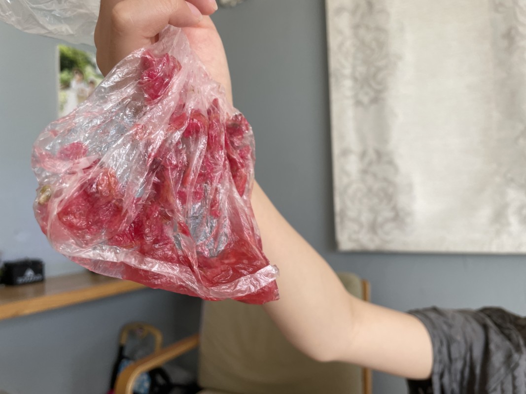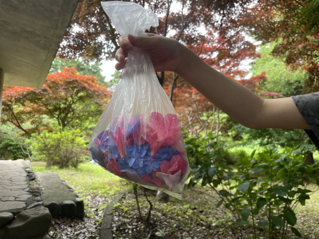 お嬢様花びらの収集が完了いたしました、いやぁ…しんどかったww、終わったら色別にビニール袋に入れて水を少し入れひたすら揉む。