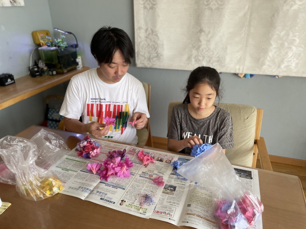 帰宅後ここから繰り広げられる、茎と花びらを分離する作業……髭を剃ることも忘れ、ひたすら娘の言う通り分離作業に専念する。