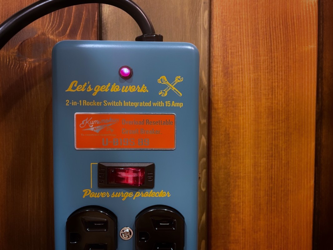 購入してきた電源タップもレトロテイストなので、壁との相性も非常に良い、タップの裏は釘などに引っ掛けられる穴がついているので、しっかり固定もできる。