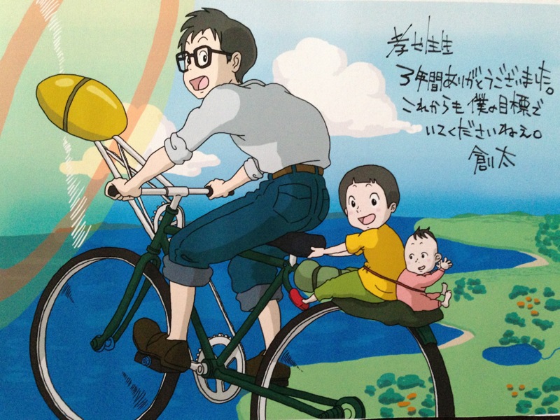 冒頭のイラストは特育のソータが描いてプレゼントしてくれた、俺と息子と娘のジブリ風ww、昔からトンボって言われてたからモデルはトンボで描いてくれています、俺トンボになれたよ!!
