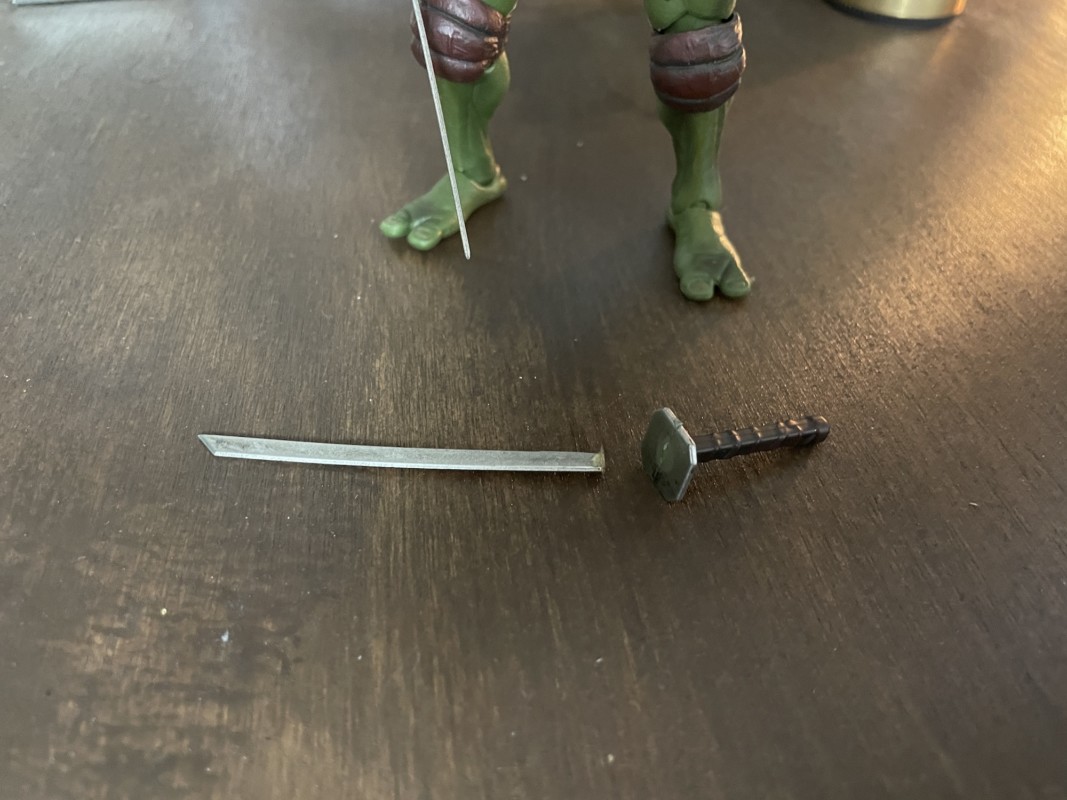 さてお次は、折れてしまっているこの刀の修復。 この刀はミュータント・タートルズのレオナルドNECA 1990年ムービーVerのフィギュアで、海外から届いたときは既に破損していたのである……本来であれば二刀流のレオナルドがカッコいいのだが、、まぁ多分直らないだろうな〜と思いずっと破損したパーツだけを保管していた。