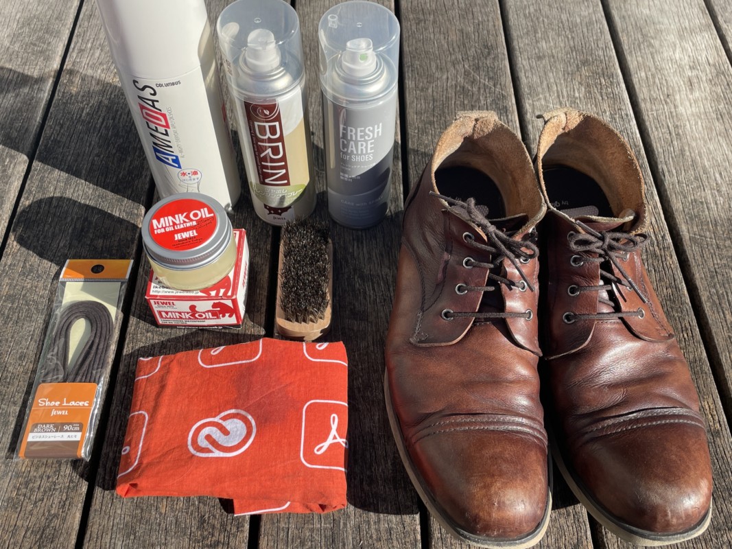 これで靴本体のケアはだいたいOK、ミンクオイルが靴に馴染むまで小一時間日陰干しする。本来ならこのとき豚毛ブラシを使ってオイルを馴染ませてあげると良いみたい、今度買おう。