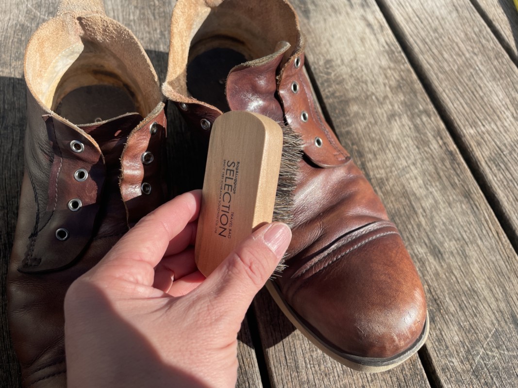 まずはブラシで靴についたホコリをしっかり落とす、シワに沿ってブラッシングし、細かい部分はホコリが残りやすいのでなるべく念入りにブラッシングしたほうが良い。