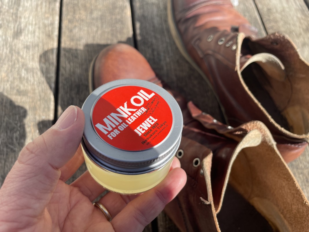 次は革製品の手入れでは定番中の定番であるミンクオイルを布に適量とり、靴になじませていく感じで塗り込んでいく。