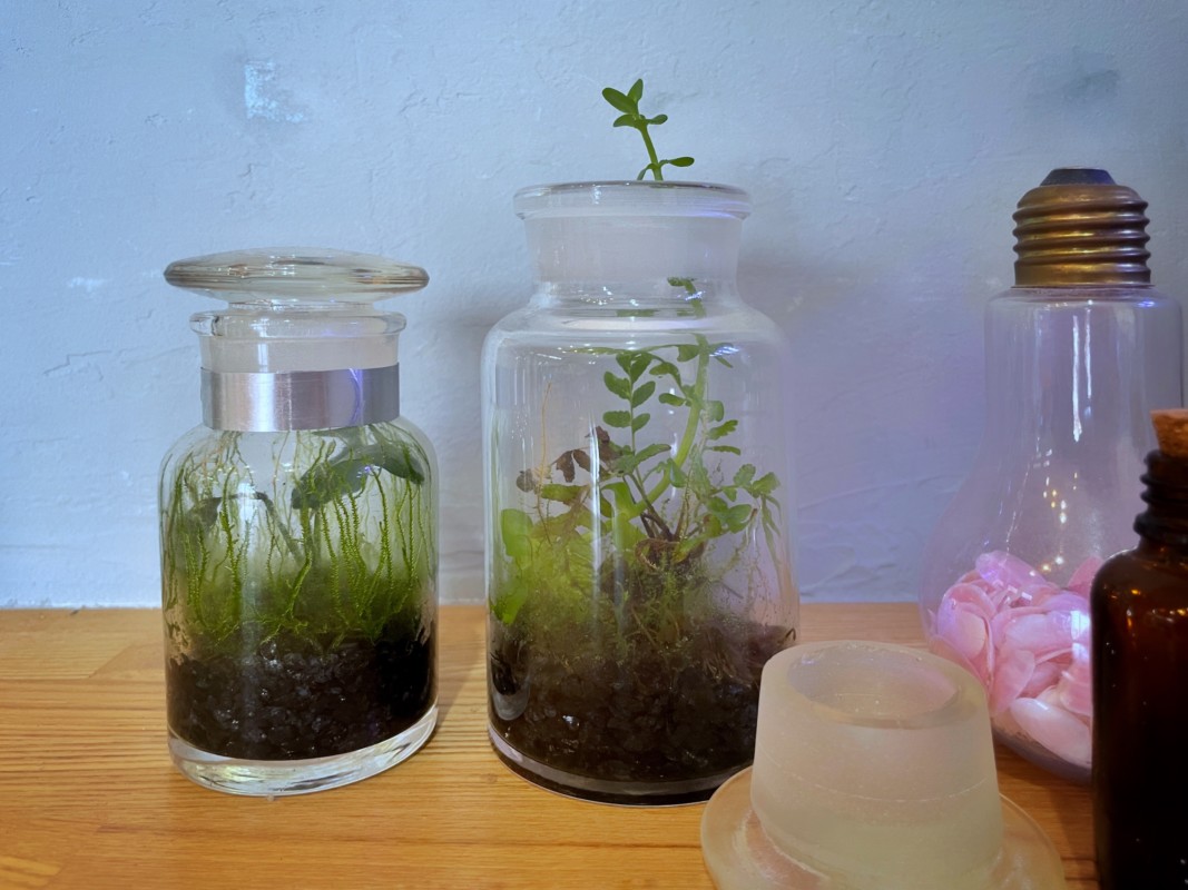 これは、犬の散歩で拾ったシダや苔たちと、アクアリウムで育ちすぎた水草を加え、薬瓶の中で光合成を繰り返しながら枯れずに育っている瓶テラリウム。 通常なら蓋を密閉した状態で育てるのが基本なのだが、水草が思った以上に上へと伸び始めてきた為、我が子の個性を伸ばすのと同じような感情でそっと蓋を取って伸ばしている。 どこまで伸びるのやら…