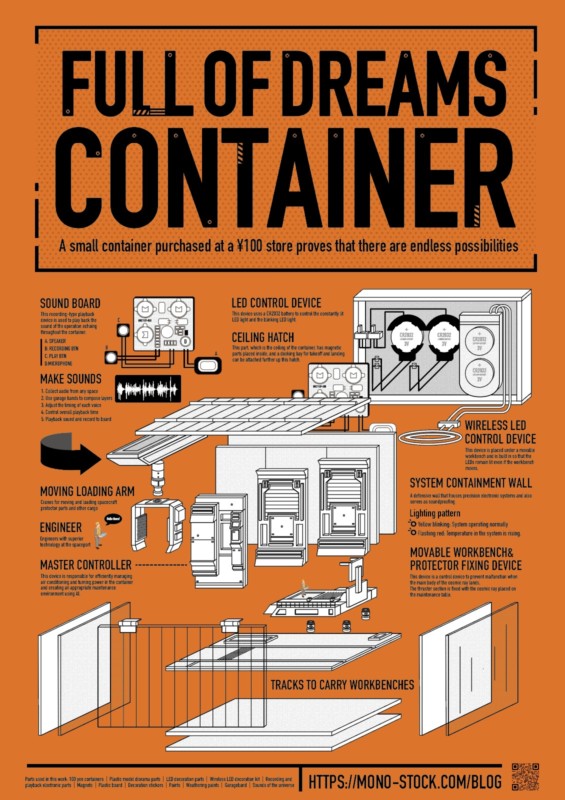 ↑このブログ記事が元になっている、100円均一で手に入れた小さなコンテナボックスを使って夢あふれる宇宙基地が広がる様子から【FULL OF DREAMS CONTAINER|夢いっぱいのコンテナ】と名付けられた作品。 展示中は、本物のコンテナも一緒に展示予定。