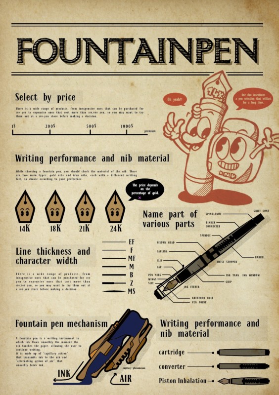 この作品は、ブログ『私と祖父の万年筆』の記事を元に、万年筆の基本的な知識を解説したポスター作品。 若い頃に祖父からもらった万年筆は、歳を取るごとに大切なものに変わっていくことに気がついた筆者が、祖父にはらう最大の敬意として万年筆の基本を勉強し直したモノを一枚のポスターにまとめたモノ。