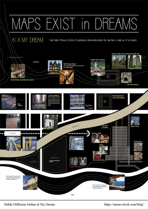 実は僕は昔から夢を見ると必ず同じ景色にいることが多い、知っている景色・建物・場所があり、とある日気がついてしまったのは『部分的に見ている夢がすべて同じ世界の中で繋がっている』というなんとも奇妙な話。 今回は昨今話題となっているAI(Stable Diffusion)を使って自分の夢を生成させ、MAPを作り上げてしまった作品である。