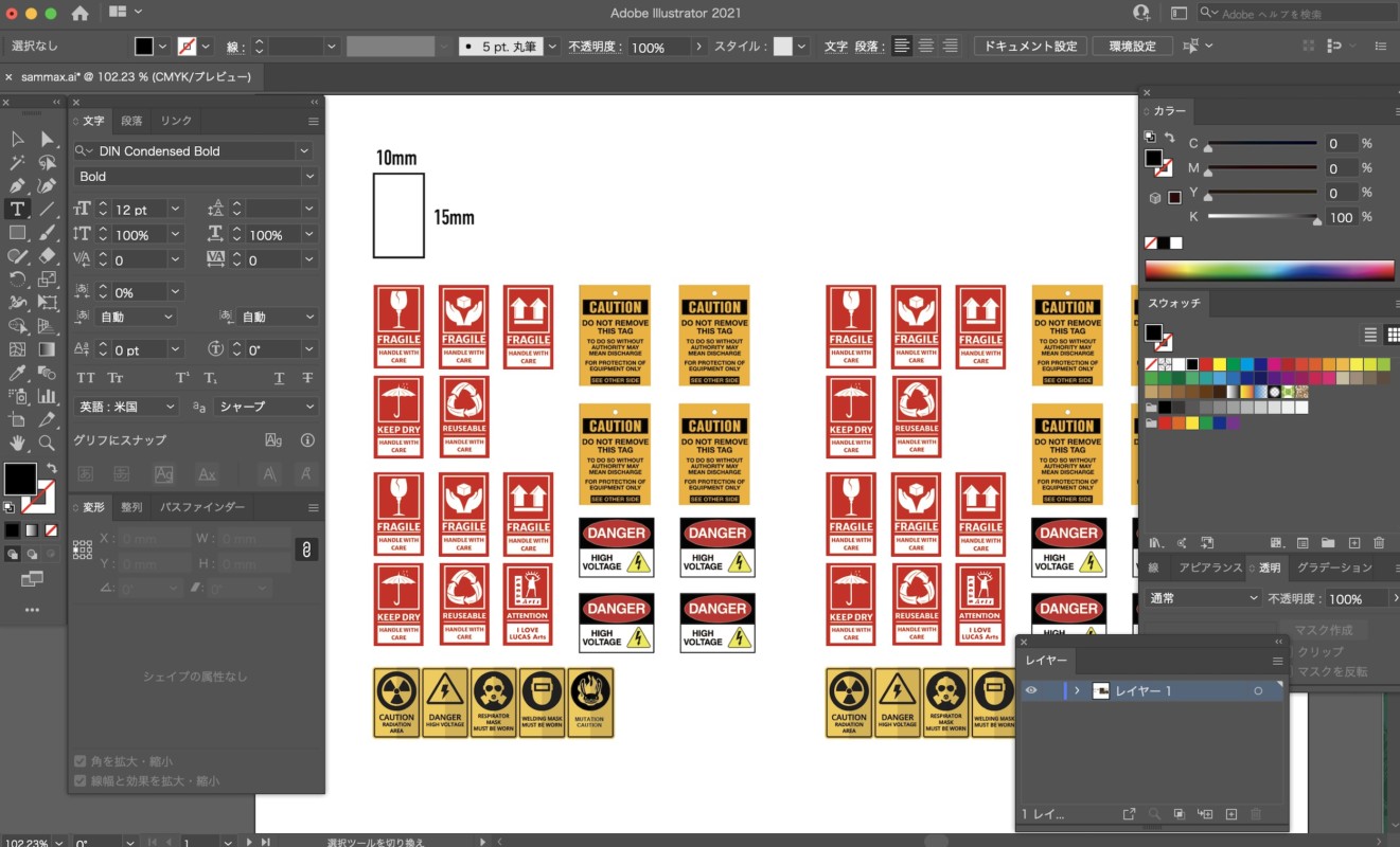 一部オリジナルでデザインしているが、ネット上で素材としてダウンロードしてきたものもある、サイズに関してはIllustratorの四角ツールで先に適正サイズを描いておいて、そこにステッカーのサイズを合わせて配置してある。