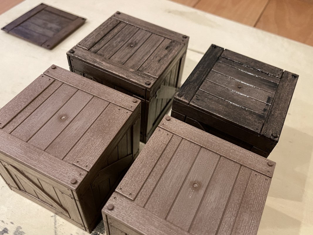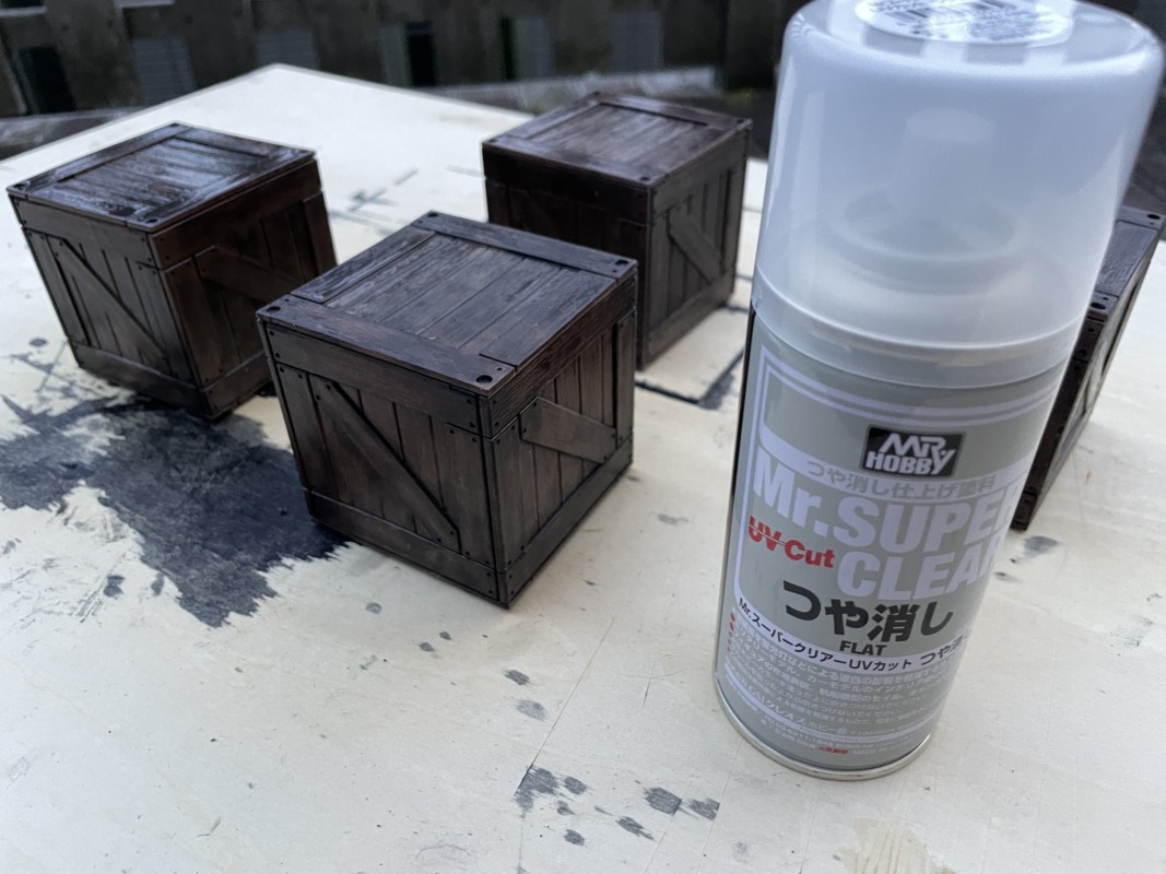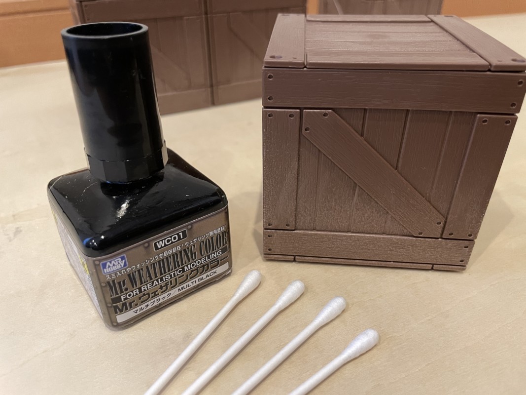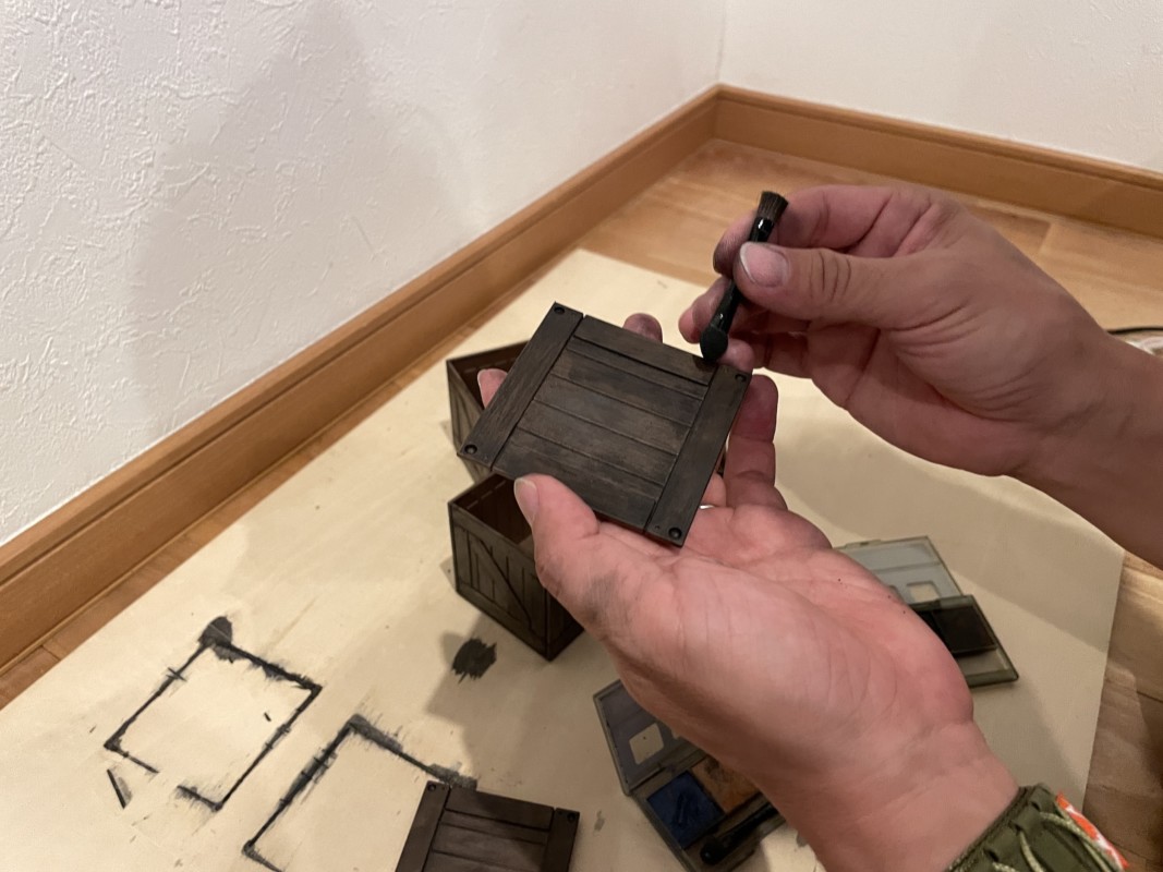 スミ入れだけで終わりでも良いのだが、今回のウェザリングアイテムはなんせ木箱なので、年季の入った自然の汚れを追求する必要がある ←必要ではない