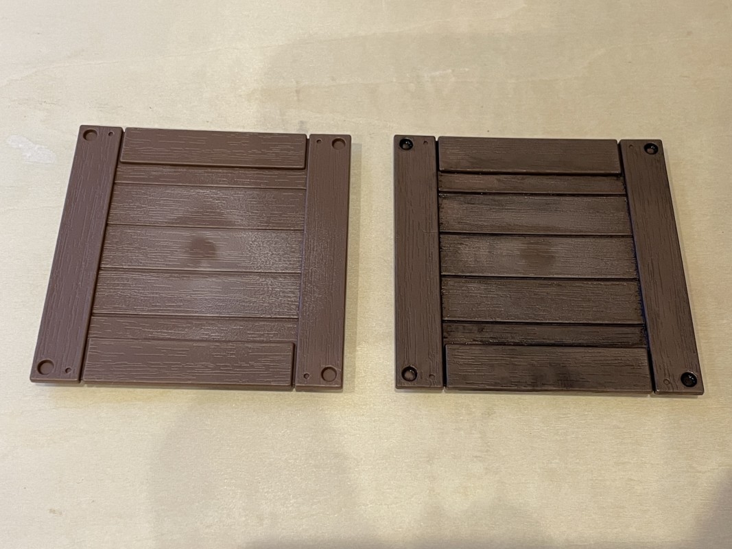 スミ入れをする前の状態とスミ入れしたての状態を比べてみる、もともと木目調の細かな模様もついていてそこにもインクがキレイに流れ込んでいくので、スミ入れしただけでも十分リアルになる。