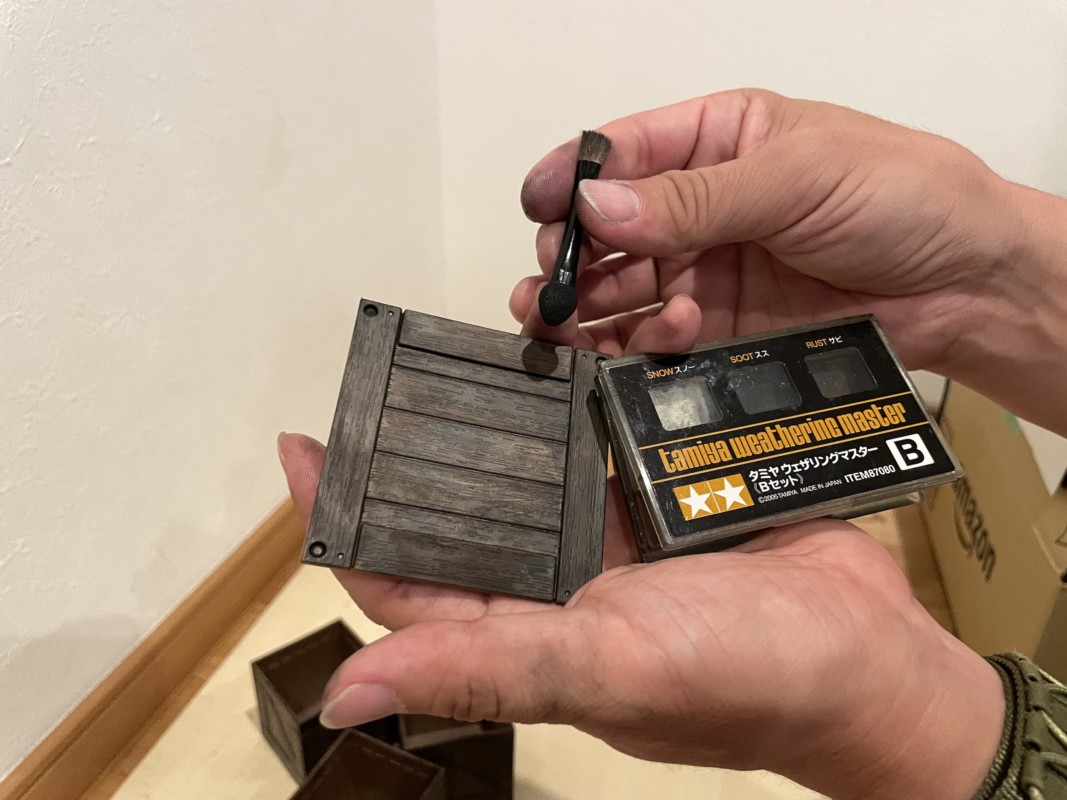 最後にステッカーの上からもウェザリングマスターを軽くポンポンすれば、リアルな木箱に大変身である!!