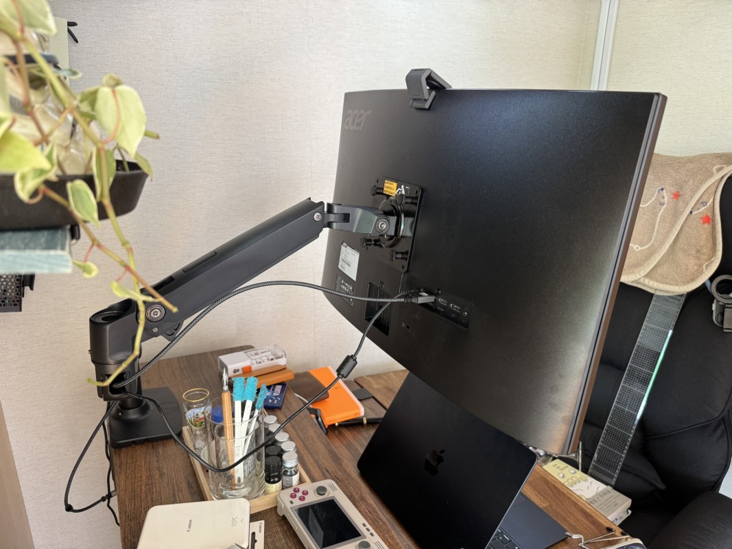 取り付けた直後だが、モニター背面から出ているケーブル類もアームの中に収納できるようになっているので、ゴチャゴチャ感もなく非常にスマートな設置ができた。
