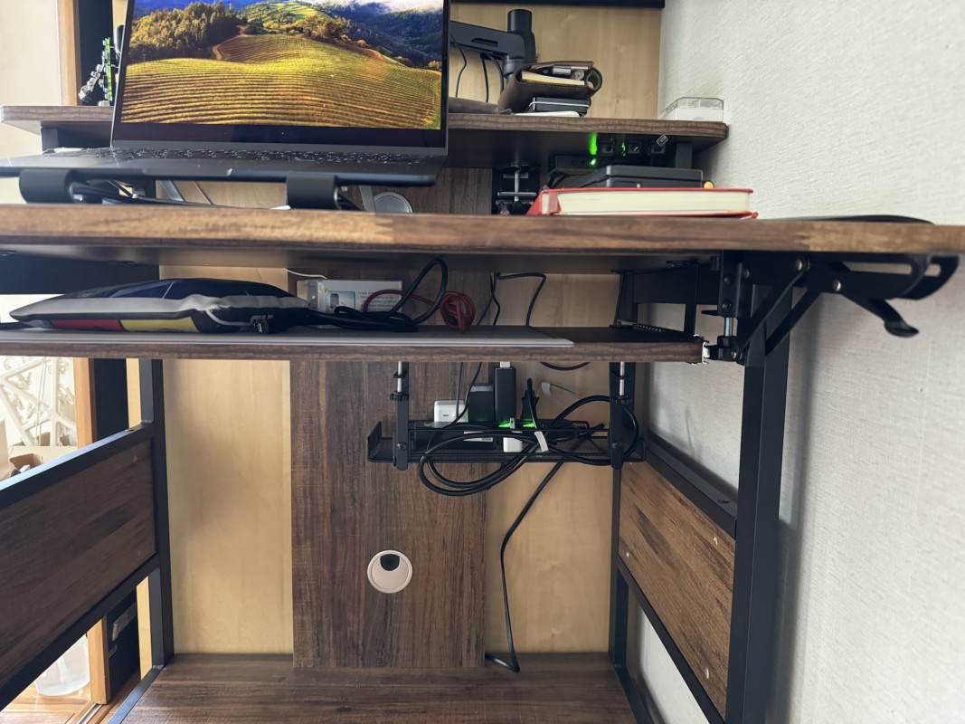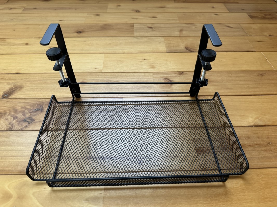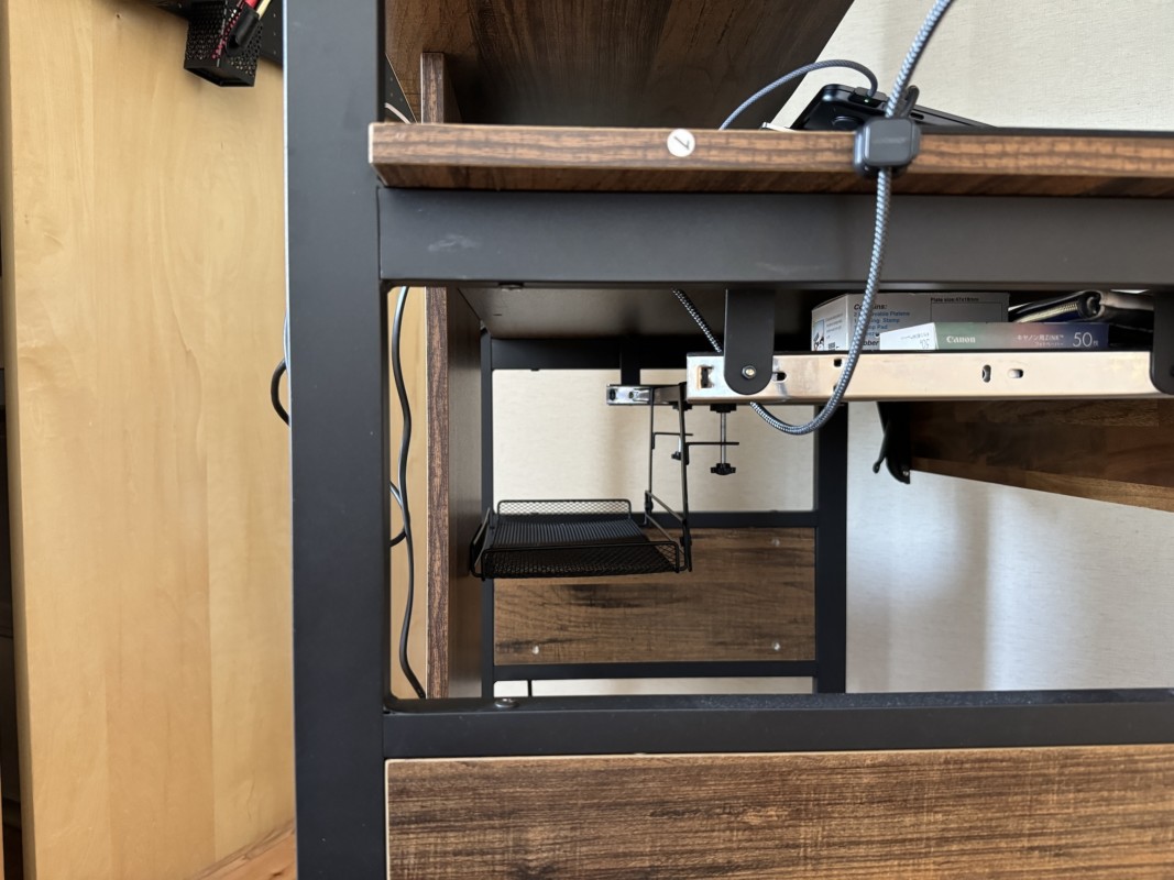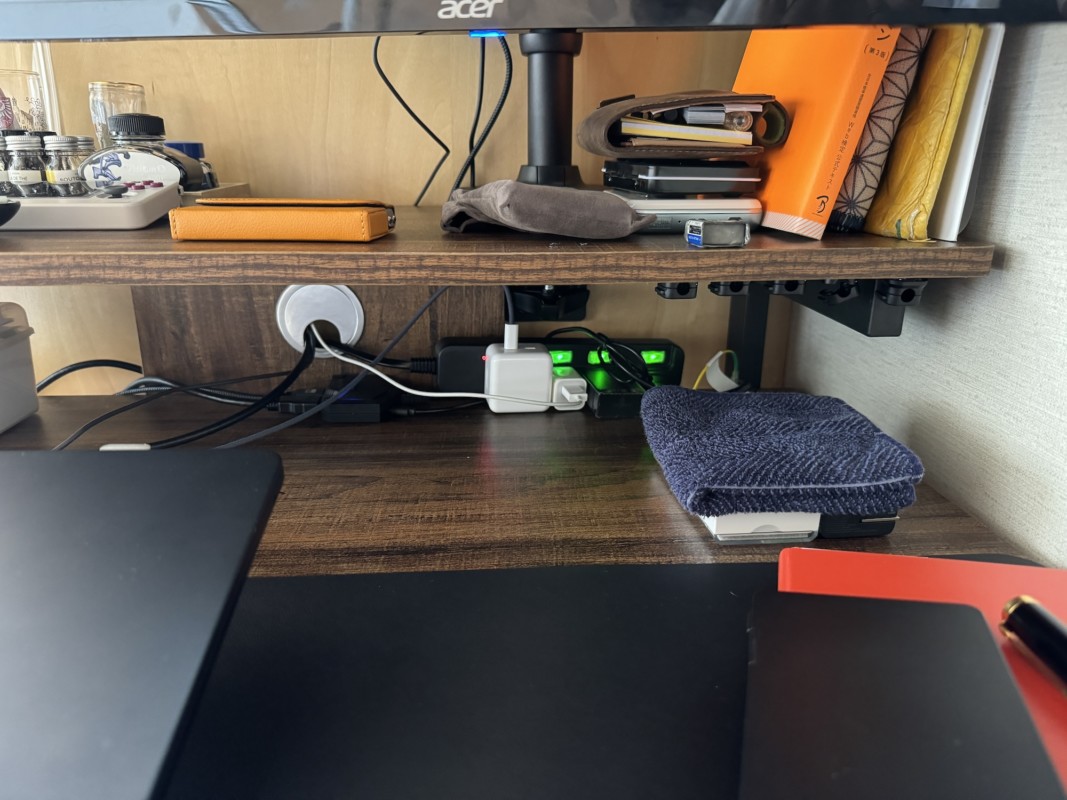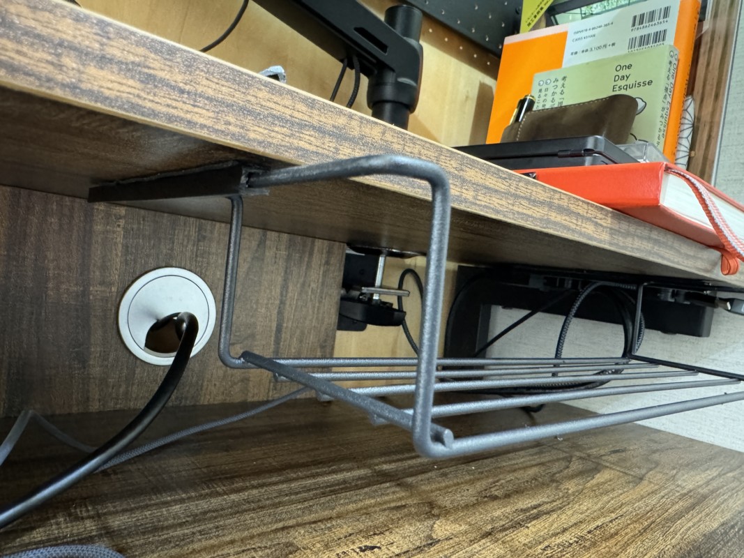 デスクの天板下のデッドスペースに取り付けて電源周りのアイテムを逃すためのラックを購入。