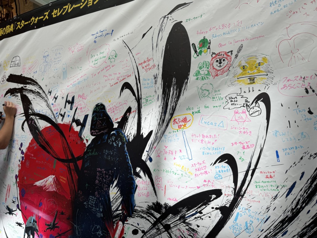 MARK IS みなとみらいでは1F グランドガレリアに巨大レゴの展示やスターウォーズファンが自由に書き込めるメッセージボードがある、我々もバッチリ書き込み&宣伝をしてきた(笑)他にも5Fの映画館で全作品の上映、B4ではポップアップストア・スタチュー展示も行われている。