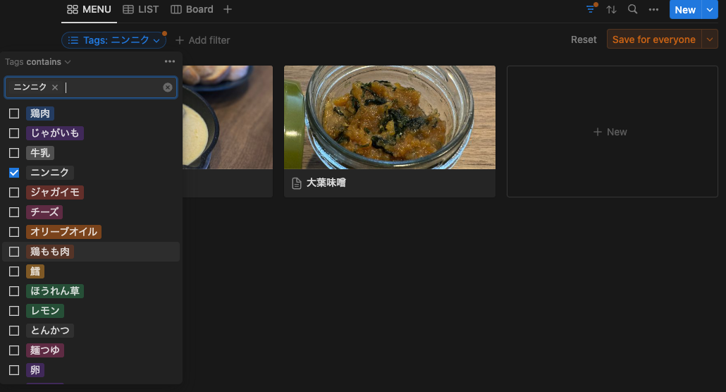 Notionにはタグ付けやフィルタで絞り込みの機能もついているため、レシピがたまって来たら、家にある材料のタグをチェックすれば今作れる料理のラインナップもすぐにできる!!