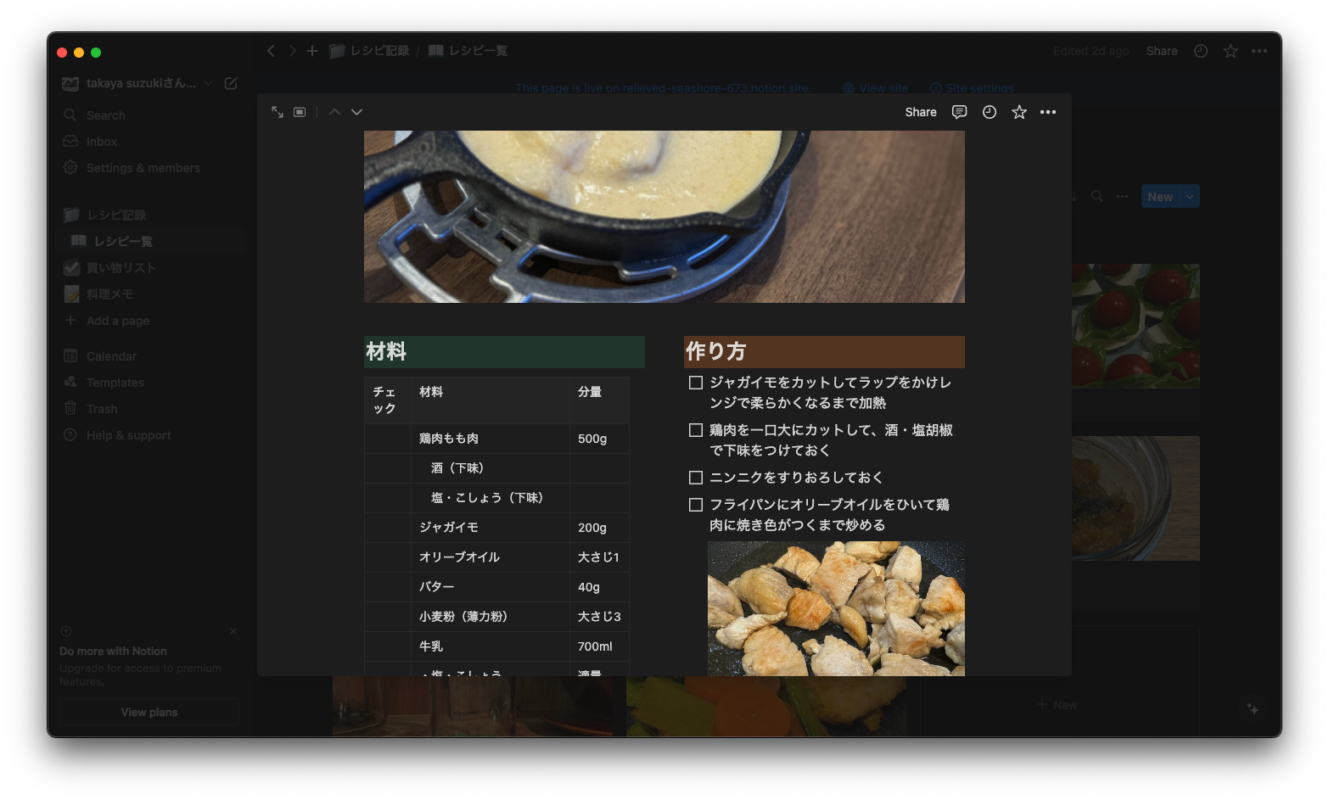 ちなみにNotionで作った上記のページはWEB上でも一般公開ができるため、下記のボタンを押していただくと誰でも僕が作ったレシピを覗き見することができてしまうという、超万能なエディターアプリである。