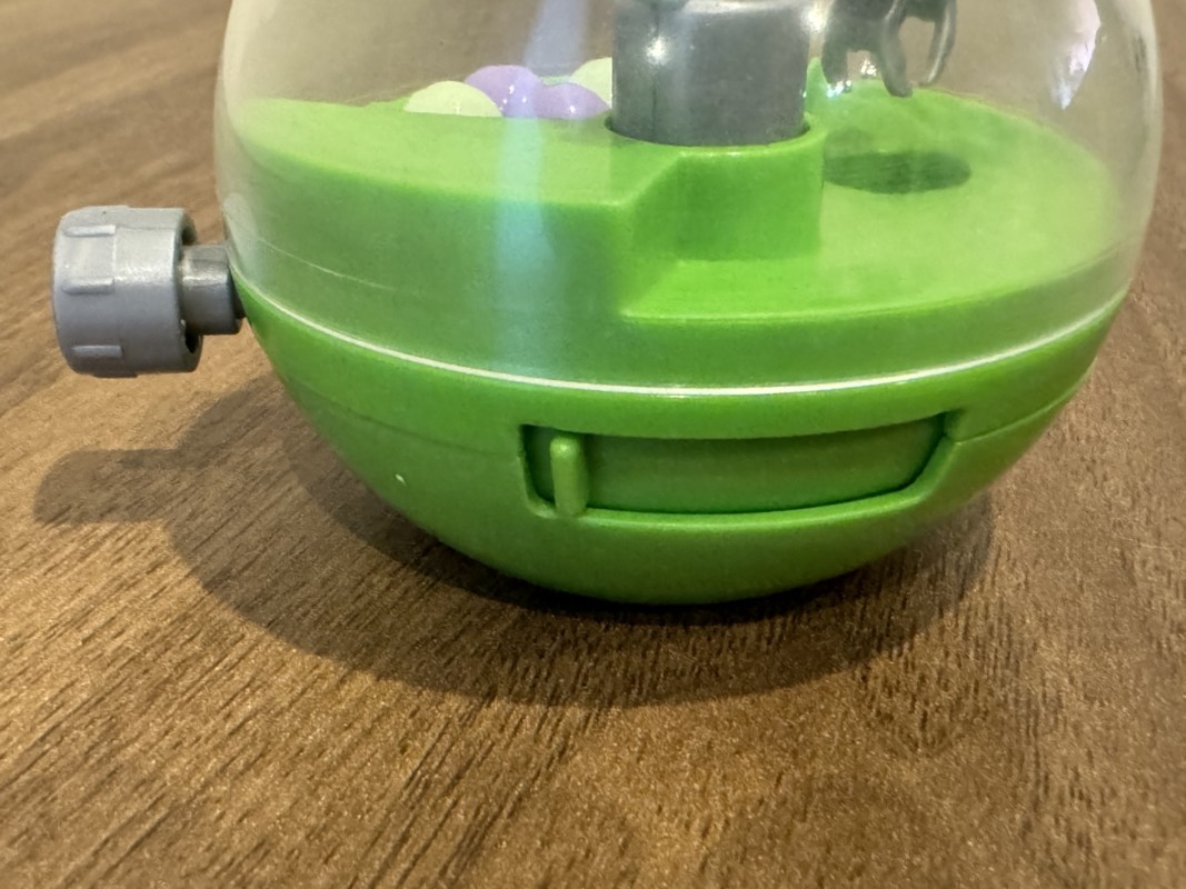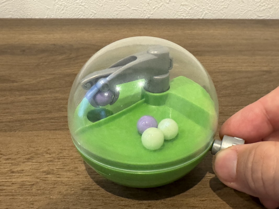 これがカプクレの全容になる、本当にガチャガチャのカプセルと同じサイズで、中にUFOキャッチャーが格納されている。 商品の代わりに直径1cm弱のボールが5つ入っている。