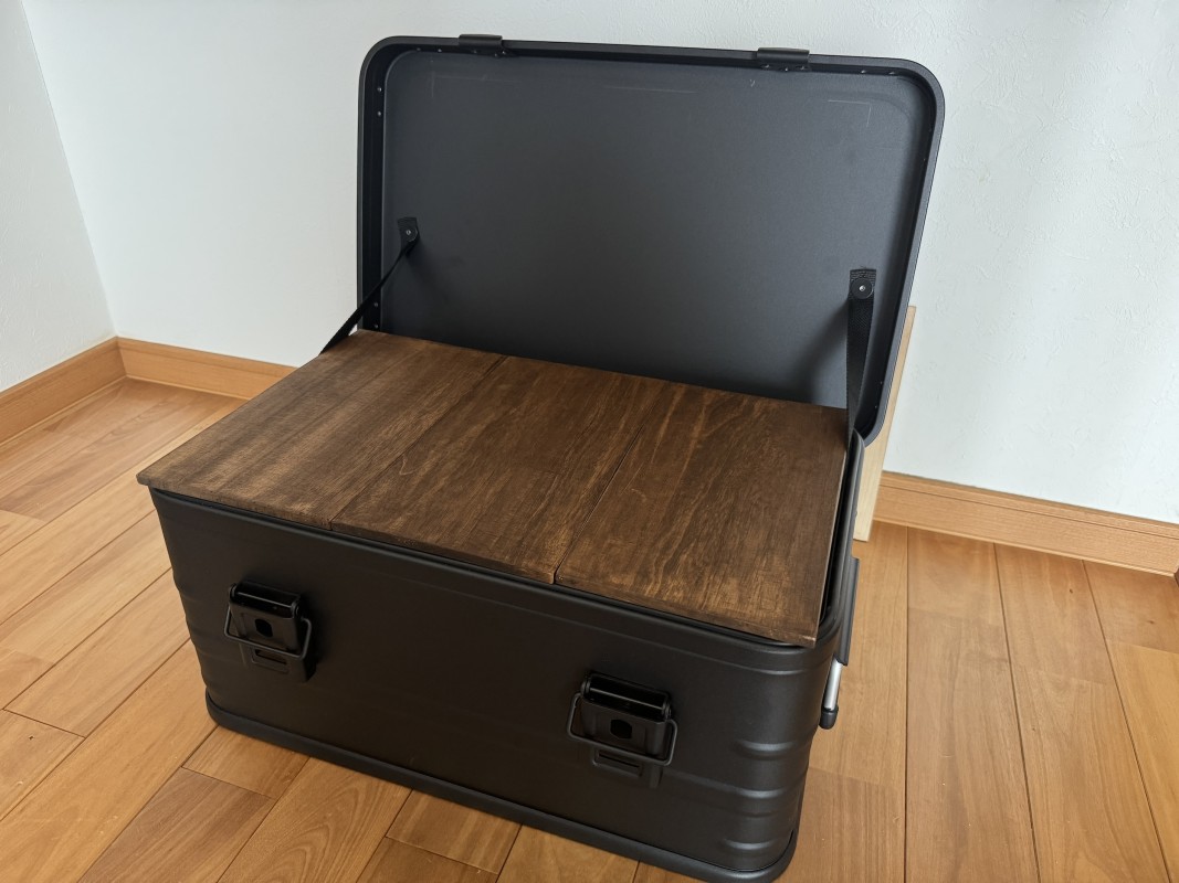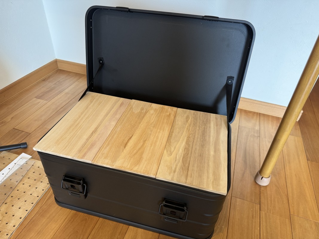 ダイソーで購入した桐の板材3枚をコンテナの上に乗るようにカットして位置を合わせてみた状態。 今回あえて桐にしたのはもちろん安価という点も大きいが、軽量というところがポイントである、コンテナに収納していくと総重量がかなりいってしまうため一つ一つのアイテムをなるべく軽量にしていくことが結果的に重要になってくる。