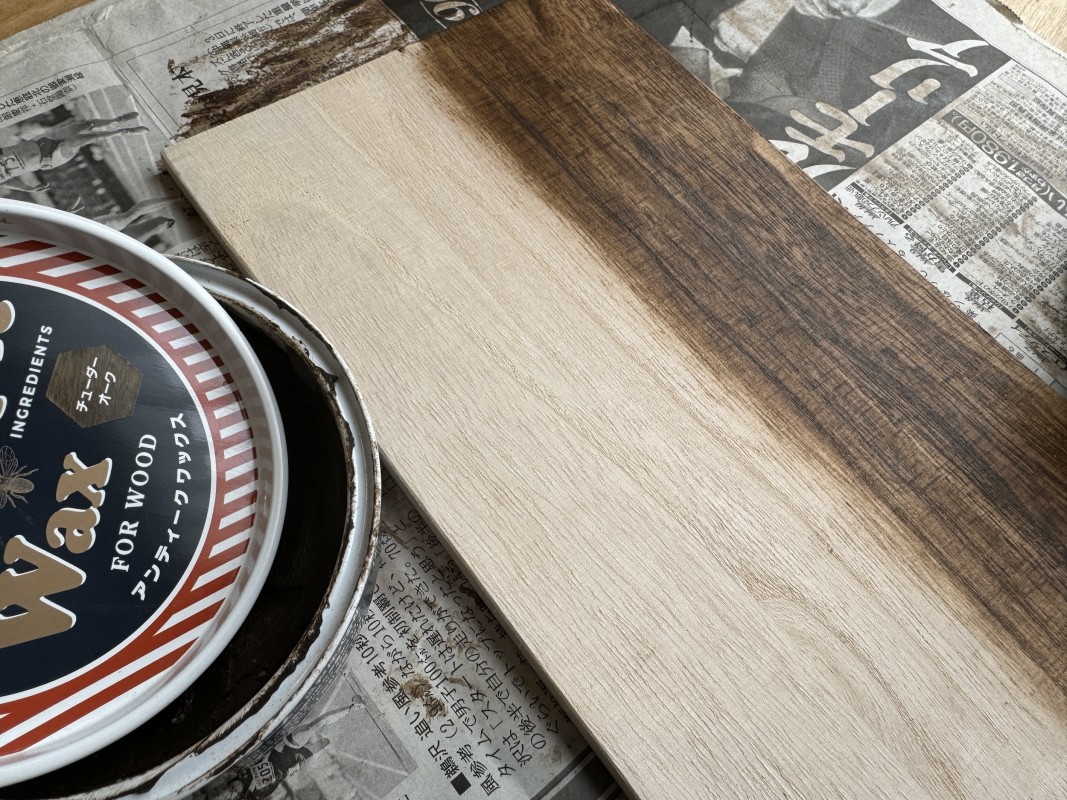 毎回DIYの時にはお世話になっているアンティークワックス(チューダーオーク)で今回も天板を塗装していく。