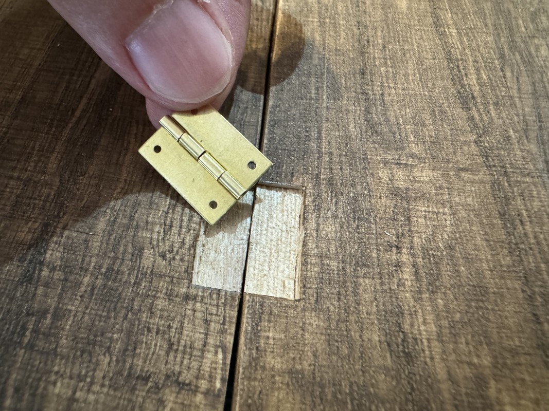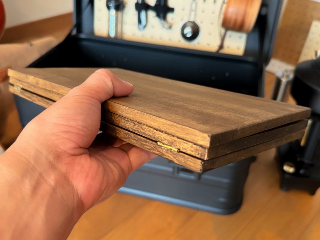これで完成でも良いのだが、天板の強度を上げる目的と収納のしやすさを考え、蝶番をつけて折りたたみ式にしてみた。