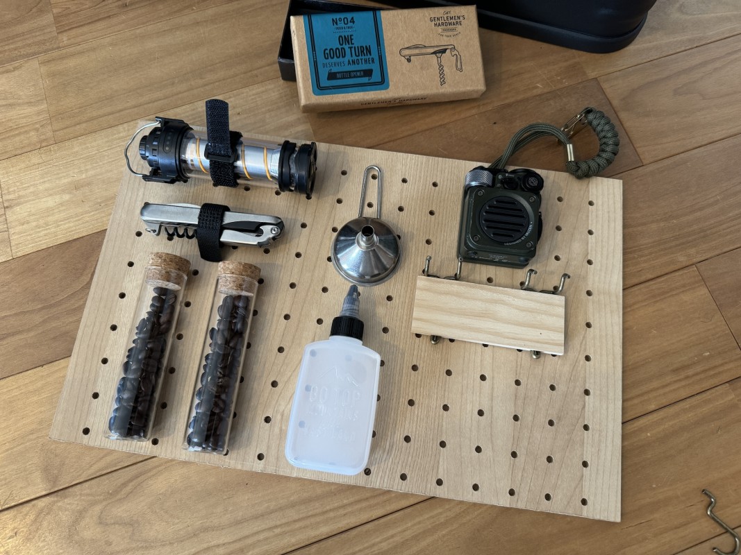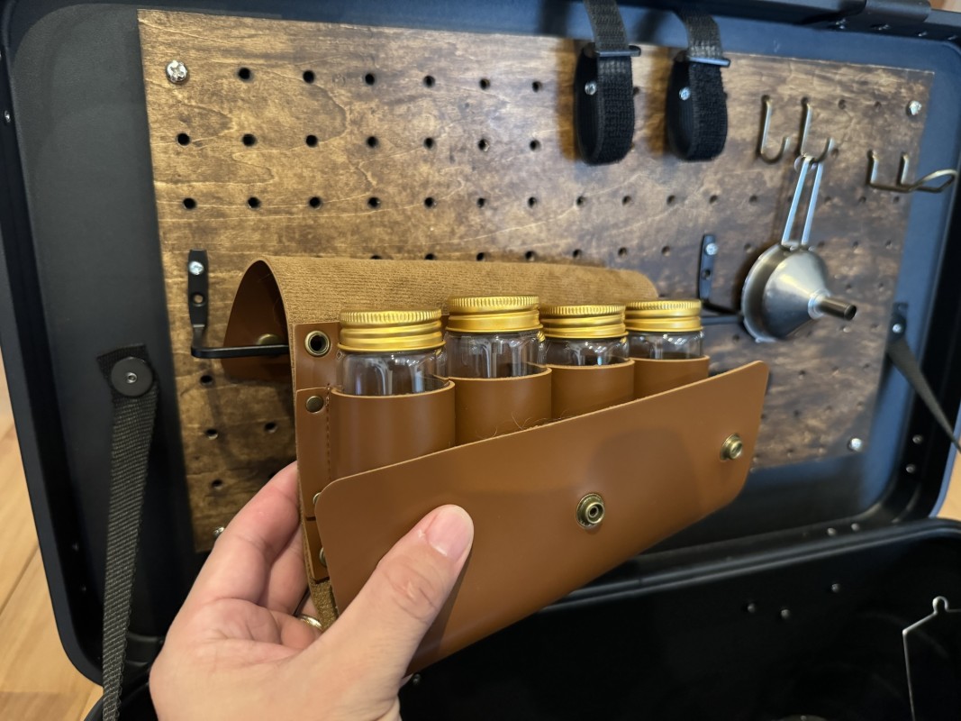 ここはアルミコンテナをカスタマイズする上で一番楽しい時間かもしれない、アイテムをどこにどう配置して、何で固定するのかを決める。 写真ではとりあえず試しに買ってみた100均の試験管にコーヒー豆を入れて使用しているが、後々変わってくる。