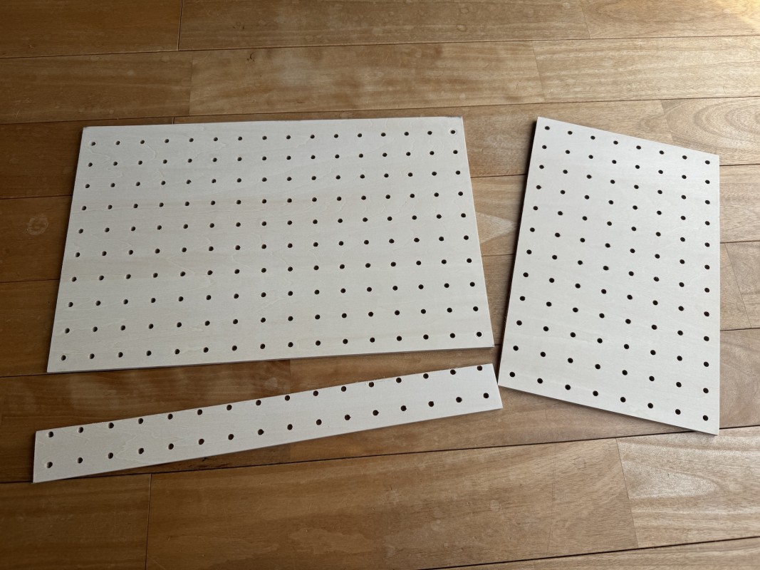 今回蓋の裏に設置するために用意したのは、一定間隔の穴があいているパンチングボードを使用することにした、パンチングボードという名前が一番メジャーだとは思うのだが、ほかにもペグボードや有孔ボードと呼ばれていて、ネットでの検索結果も様々なので購入時は注意した方が良い。